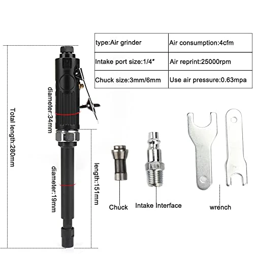 - 2. Collet size:1/4″ (6mm) and 1/8″ (3mm).Working pressure: 90PSI; Air inlet size:1/4-in; Air consumption: 4CFM.