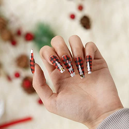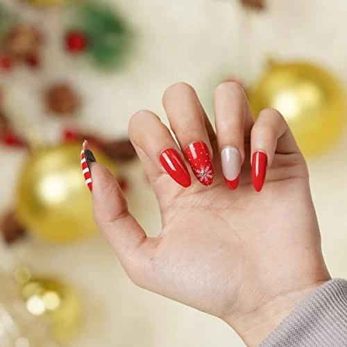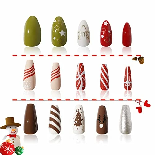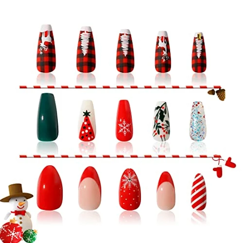 - [Various Patterns] – Coming in 3 Christmas themed designs for selection, which helps finish your nail design more easily. Features Christmas symbols, like Snowflakes, Elk, Gingerbread Man, Christmas tree, and the traditional color of red, green, gold and white. These Christmas Fake Nails surely give you a Christmas season cheerful this year!
