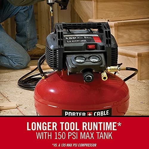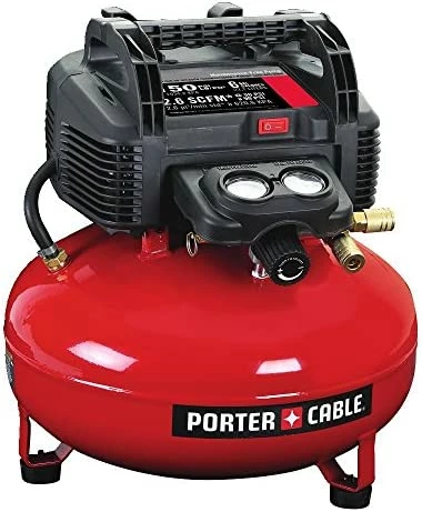 - 6 gal Pancake style tank of the PORTER-CABLE air compressor is made for stability, includes water drain valve and rubber feet