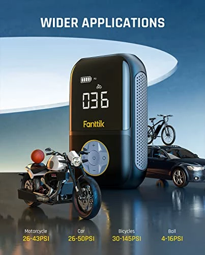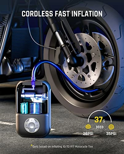 - [Multi-function Fast Inflating] Features with the high-performance chip and 150psi high-pressure capacity, this powerful air compressor inflates fast, tires of size 110/70 R17 can be filled in just 38 seconds(28-35PSI). Perfect for inflating motorcycles, bikes, cars, balls, swim rings and other inflatables.