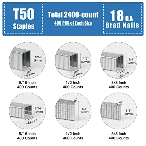 - Total quantity: There are 2400 pieces T50 staples and 18 gauge brad nails with 6 different sizes in the package, T50 staples: 5/16″-400, 3/8″-400, 1/2″-400, 9/16″-400; 18 gauge brad nails: 3/8″-400, 1/2″-400. You can choose different sizes of nails according to actual needs.