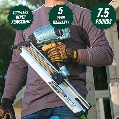 Weighing only 7. 5 lbs, this framing nailer is easy to use all day, while still providing the power similar to other bulkier and heavier framing nailers.