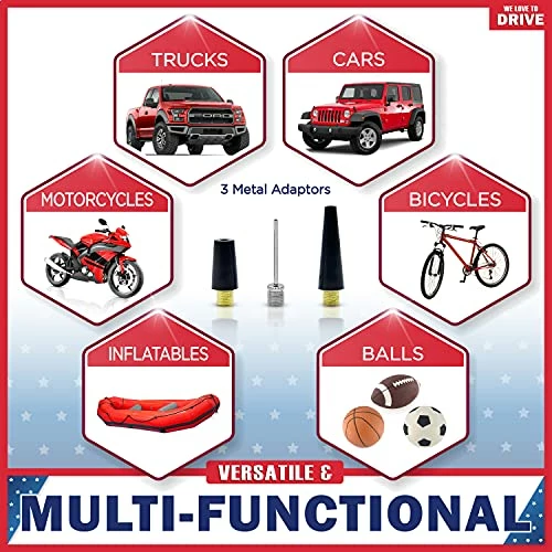 - ? Adaptable Air – Use your 12V air compressor kit to inflate a variety of tires and sporting equipment. Heavy Duty metal or hard plastic, Compress air up to 150 PSI and channel it through your choice of 3 different threaded adaptors.
