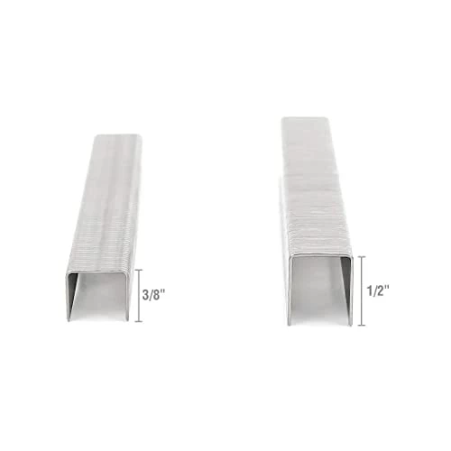 - The Arrow Fastener 3/8″ T50 506SS1 stainless steel staples:3/8 in. crown size, 3/8 in. leg length, includes 1000 staples.
