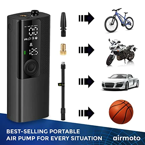 - Powerful Portable Inflation: The Airmoto air pump packs 120 PSI output and is easy to store in your pocket, backpack or car at 1.2 lbs and 6″ long. The charging cable is a USB-C type for inflation on the go.