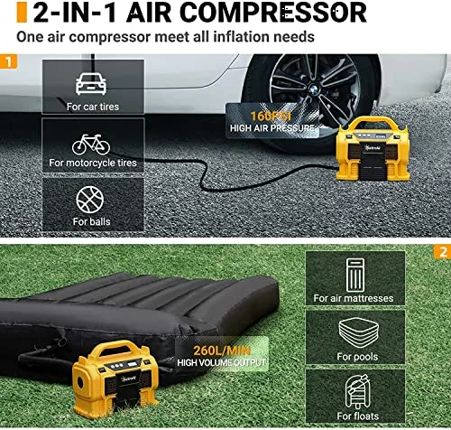 - Tires & Paddling pool: Two inflation modes. The air compressor can inflate tires, air mattresses, or large inflatable objects fast. You can inflate tires and inflatable items to meet your entertainment demands with this air compressor.